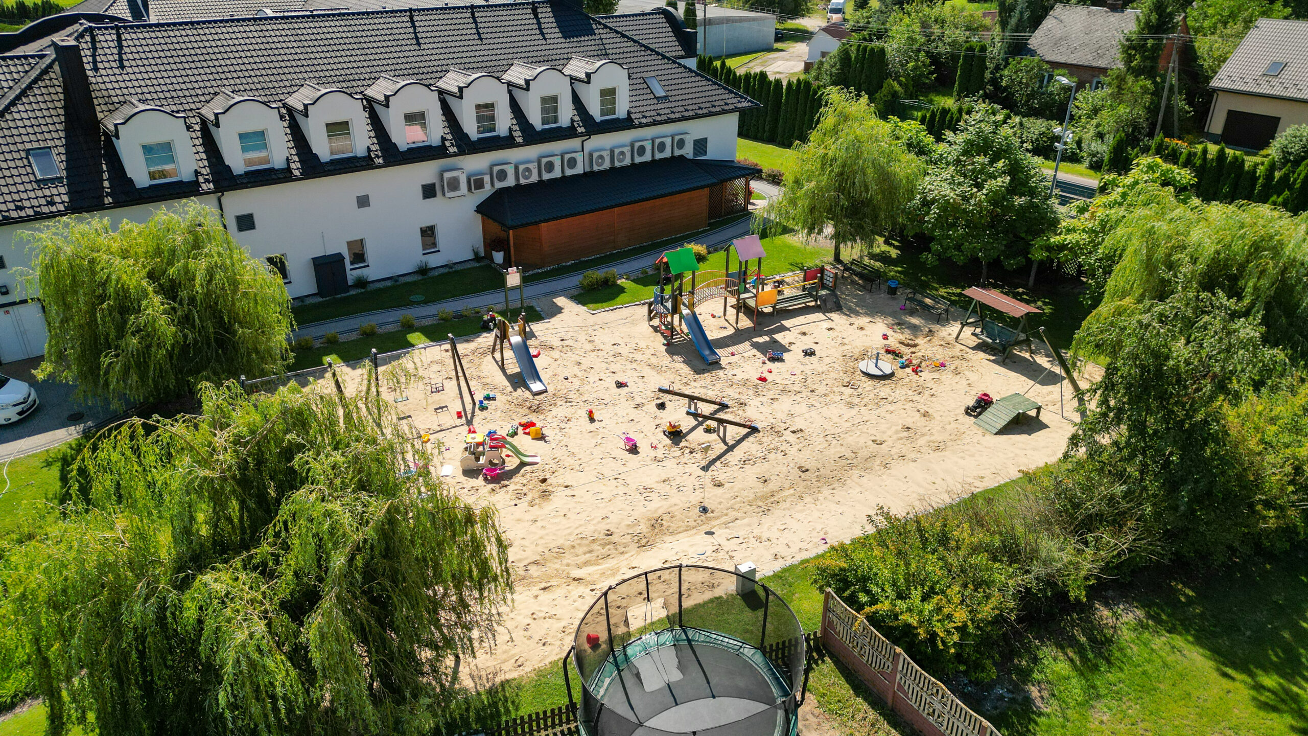 Przy dobrej pogodzie zapraszamy wszystkie dzieci do certyfikowanego placu zabaw zajmującego ok 300m². Na bezpiecznej piaskowej nawierzchni znajdują się huśtawki, zjeżdżalnie, zestawy zabawowe, rolka i inne atrakcje. Na indywidualne zamówienia wynajmujemy również dmuchany zamek dla dzieci.